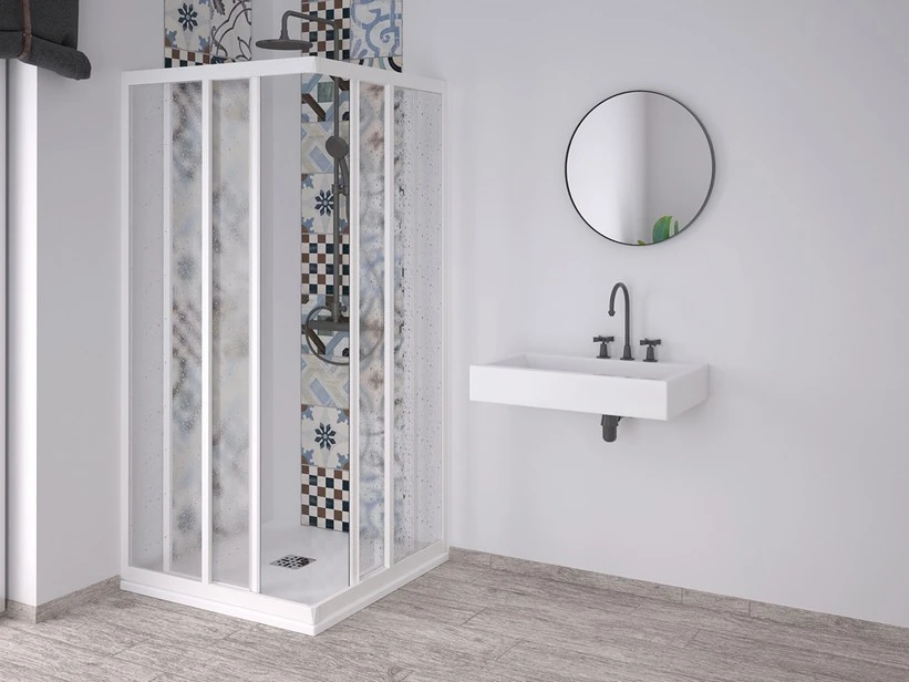 SKILL box doccia 80×100 h190,2 reversibile con 2 ante scorrevoli – riducibile cm. 80-75/100-95 – installazione in angolo – acrilico spessore 1,8 mm. semitrasparente effetto bagnato – profili pvc bianco pastello semilucido