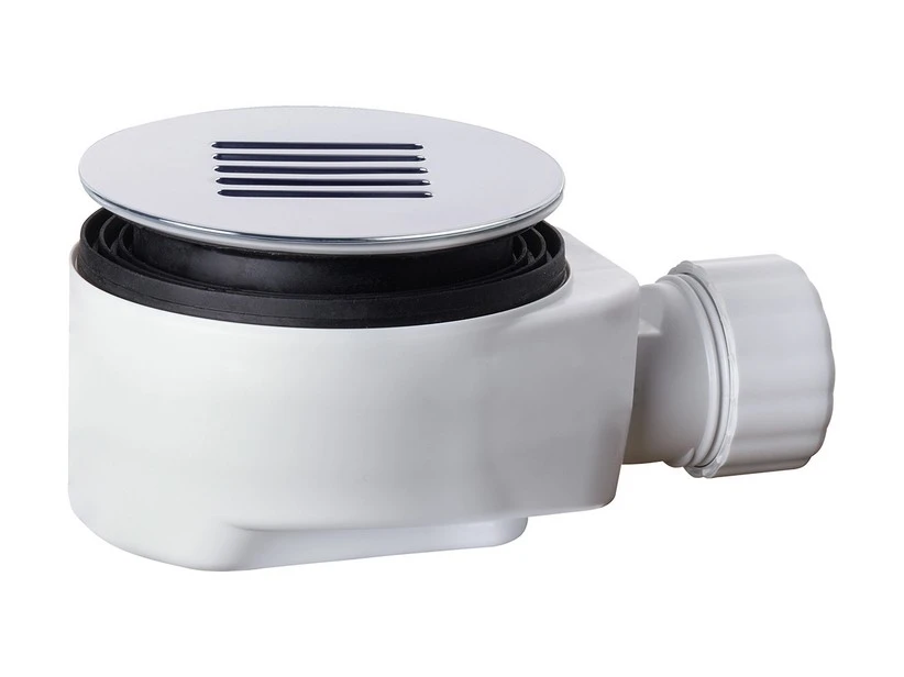 SLATE piletta doccia ø 90 mm. ribassata H 7 cm. in pp a scarico orizzontale con griglia piatta ottone cromato